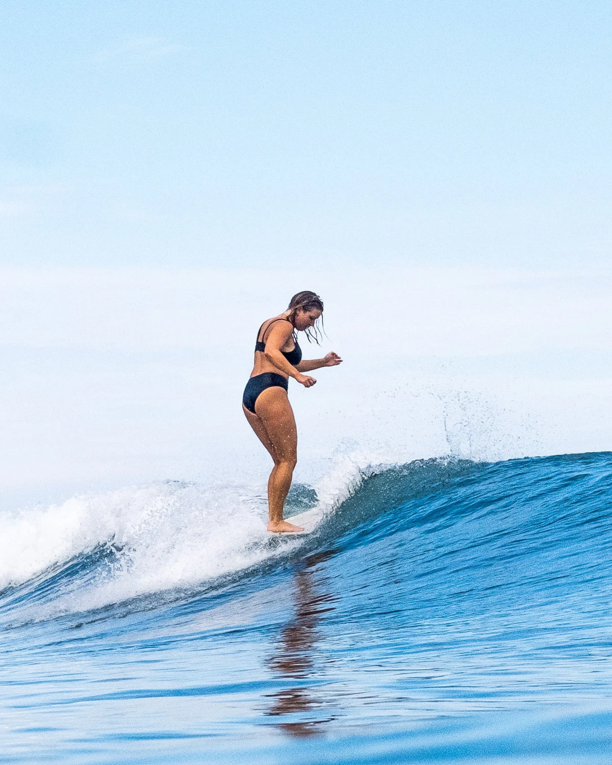 It’s all about balance. The Brasilia High Waist Bikini Bottom has a higher leg cut that visually lengthens your legs, balanced by a high waist to create a classy vintage silhouette. Now featured in a sleek solid black. Pairs with the