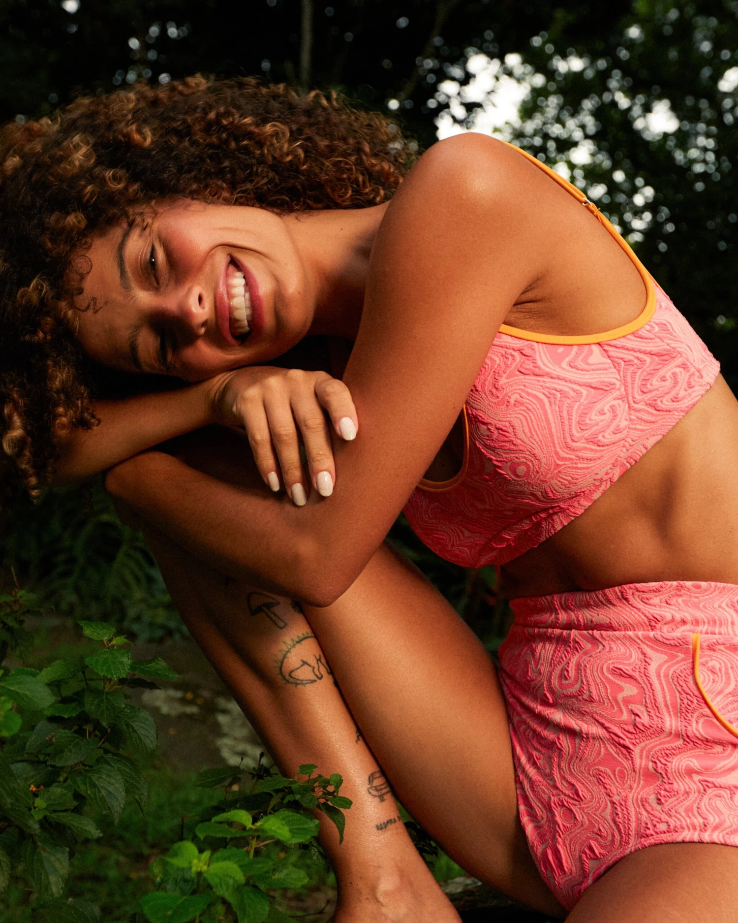 Under a striped beach umbrella or perched in trim, the Georgia High Waist Bikini Bottom radiates vintage femininity. The high waist design, contrasting curved trim, and retro leg cut shape a classy and comfortable silhouette.
