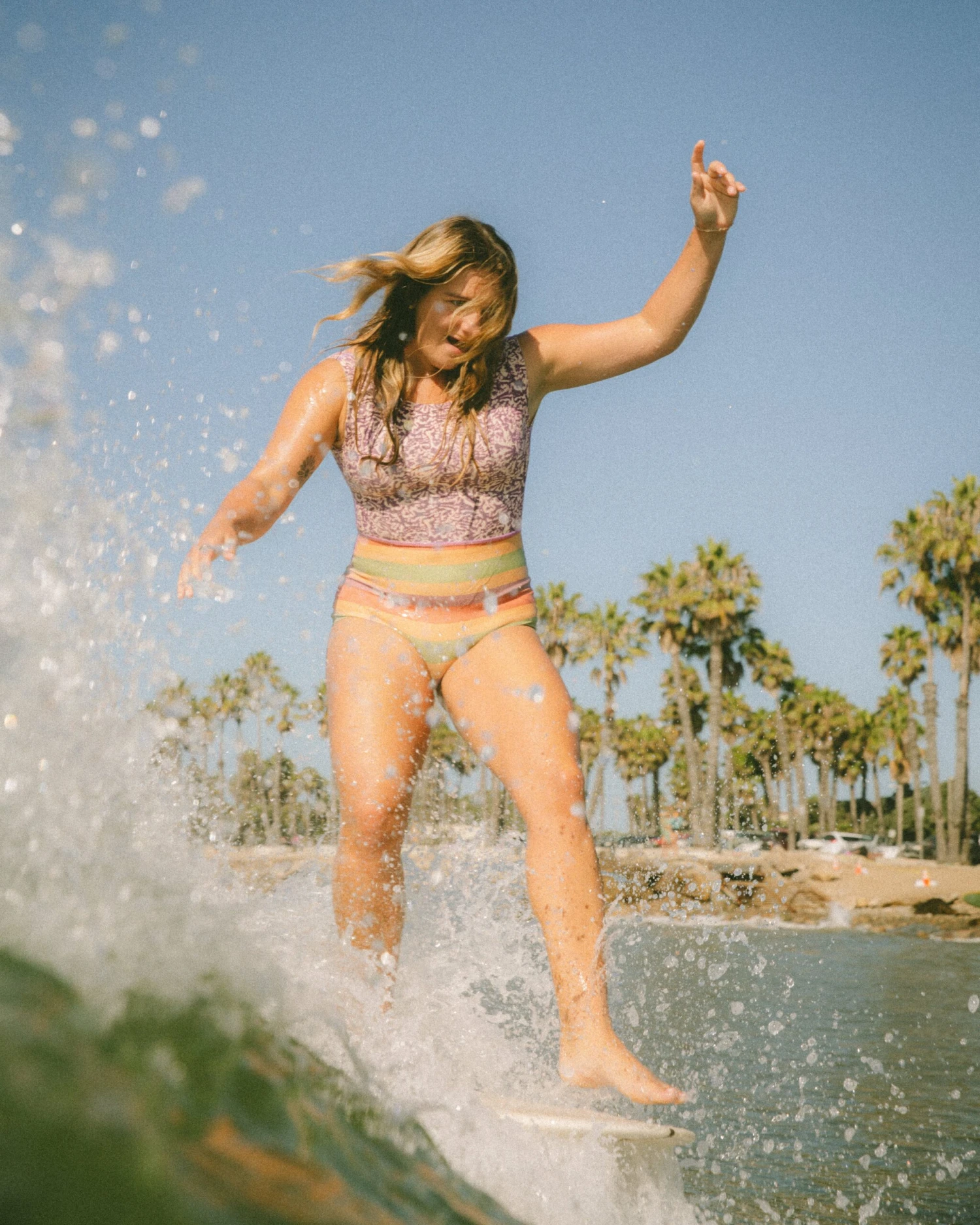 Modern minimalists will appreciate the Lido One-Piece’s clean silhouette and balanced color-blocking. With a high neckline, retro cut bottom, and a sultry deep-V back, the Lido in recycled C-Skin fluidly glides over your body’s curves.