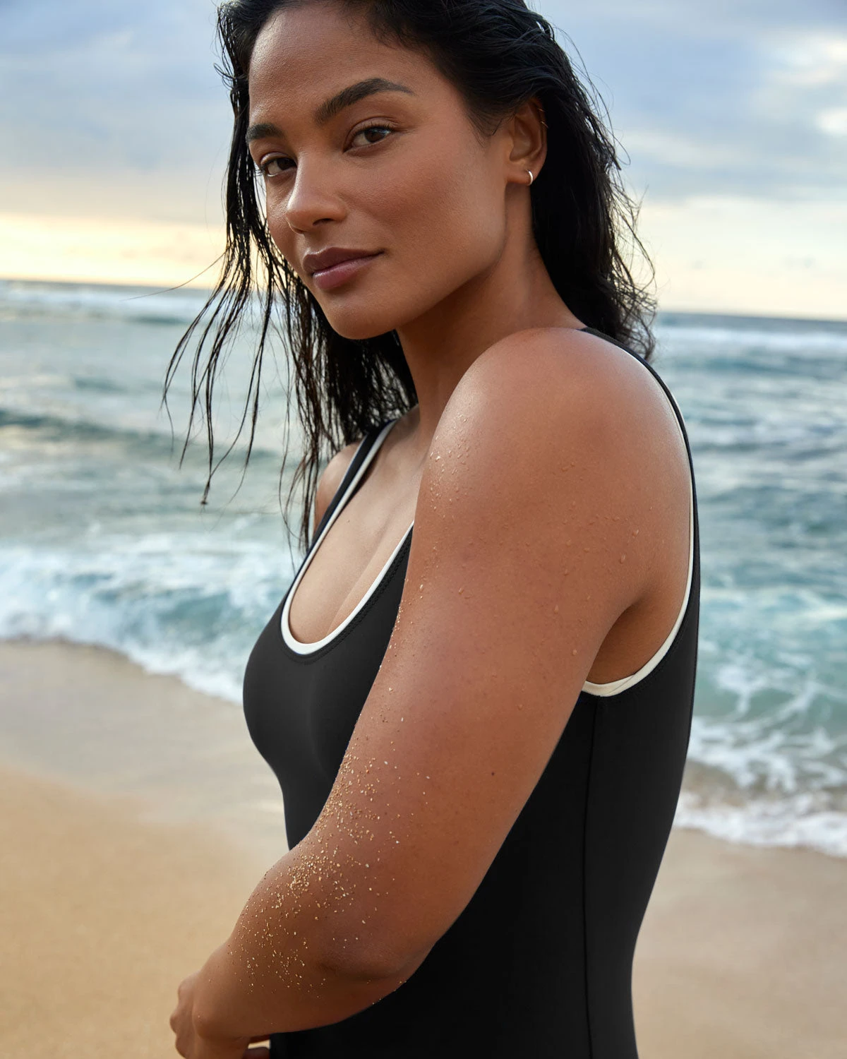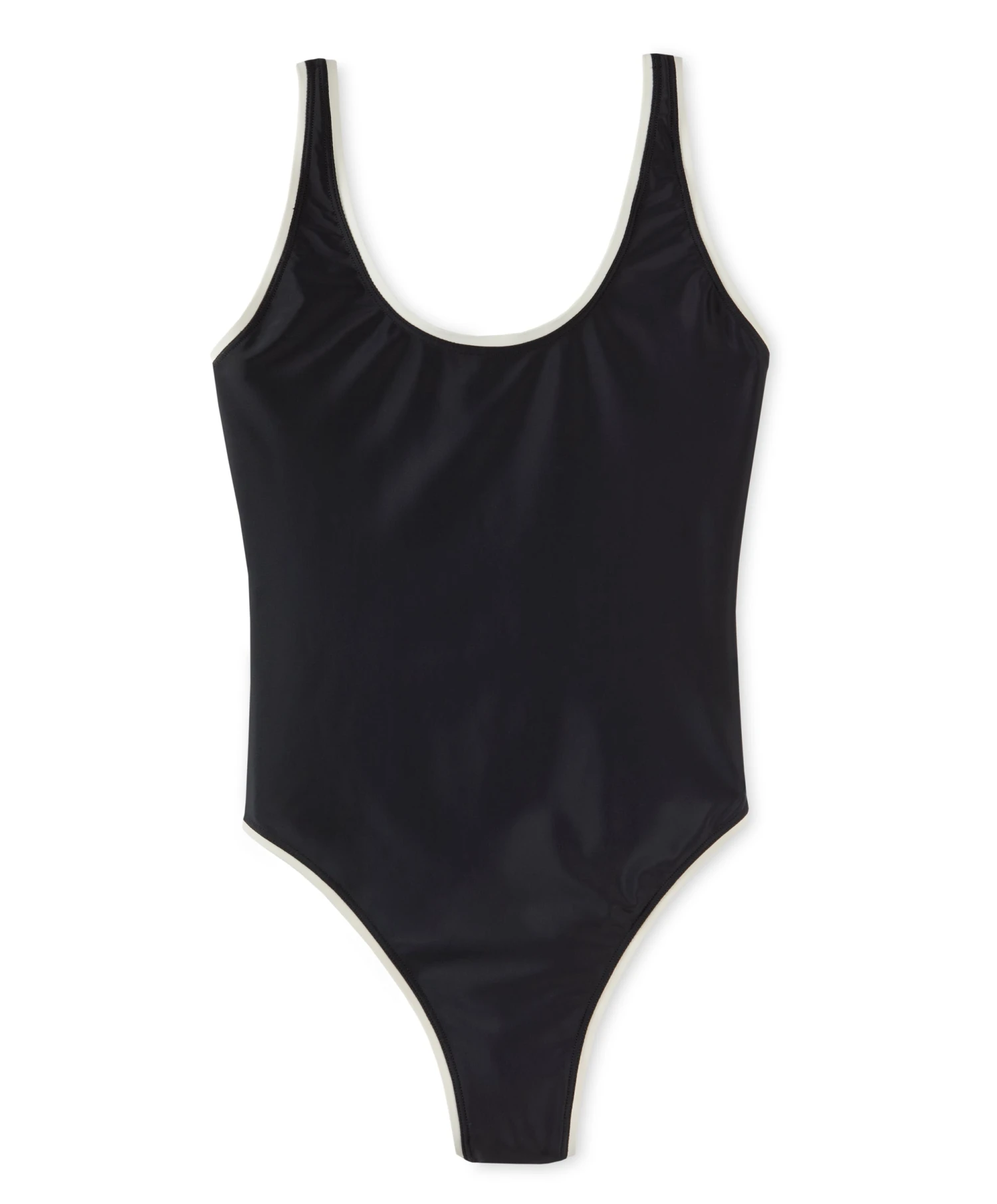 Featuring a slightly higher cut leg,flattering scoop neckline, and ivory trim along all edges, this versatile suit is fully lined and offers a supportive fit.